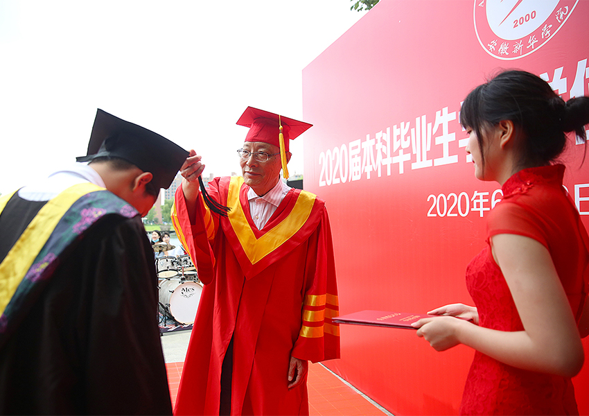 新華集團(tuán)? 安徽新華學(xué)院校長(zhǎng)石秀和為畢業(yè)生代表正冠扶蘇