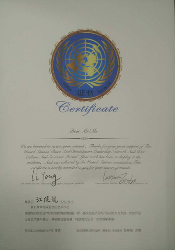 近年來,安徽新華學院鼓勵并支持廣大教師積極參加國內外各類活動。此次論壇中,江健龍作品入選聯合國“和平發展領袖網絡暨‘一帶一路’文化經濟論壇”參展作品并被收藏,為安徽新華學院教師的藝術作品走出國門樹立了信心,開拓了學術發展道路,這也必將激發該校教師的藝術創作潛質進一步提高教學專業水平。